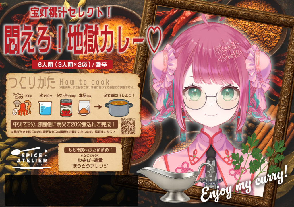 2025年10月1日~10月14日の期間中、宝灯桃汁が「スパイスアトリエ」企画にて、スパイスや具材を完全に監修したオリジナルコラボカレー「宝灯桃汁セレクト!悶えろ!地獄カレー」を販売しました。
