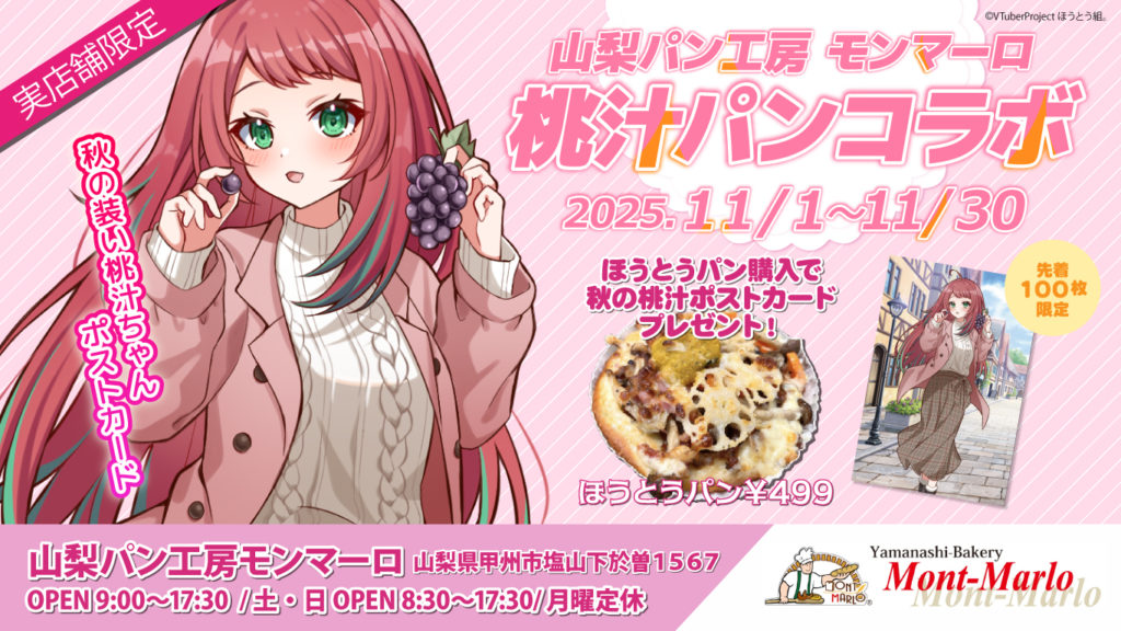 さらに期間中、桃汁コラボパン「ほうとうパン(甲州宝灯パン)」を購入し、「ノベルティ希望です」とお伝えくださった方、先着100名さま限定で「秋の桃汁ポストカード」を配布いたします。